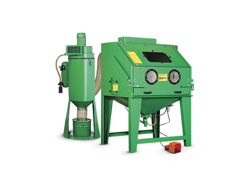 Standardní provedení: Každá kabina je plně svařovaná a vybavená injektorovým tryskacím systémem, který je namontován přímo na kabině. Součástí je ruční tryskací pistole GX, tryska GXT-8 z karbidu wolframu, odolné gumové rukavice RGS-600, pneumatický pilotní ventil, dálkové ovládání pomocí nožního ventilu a vzduchový filtr s vypouštěcím ventilem. Dále je k dispozici volně stojící patronový filtr DC-370 pro účinné odlučování prachu.