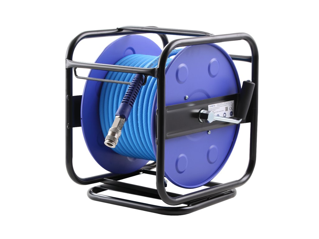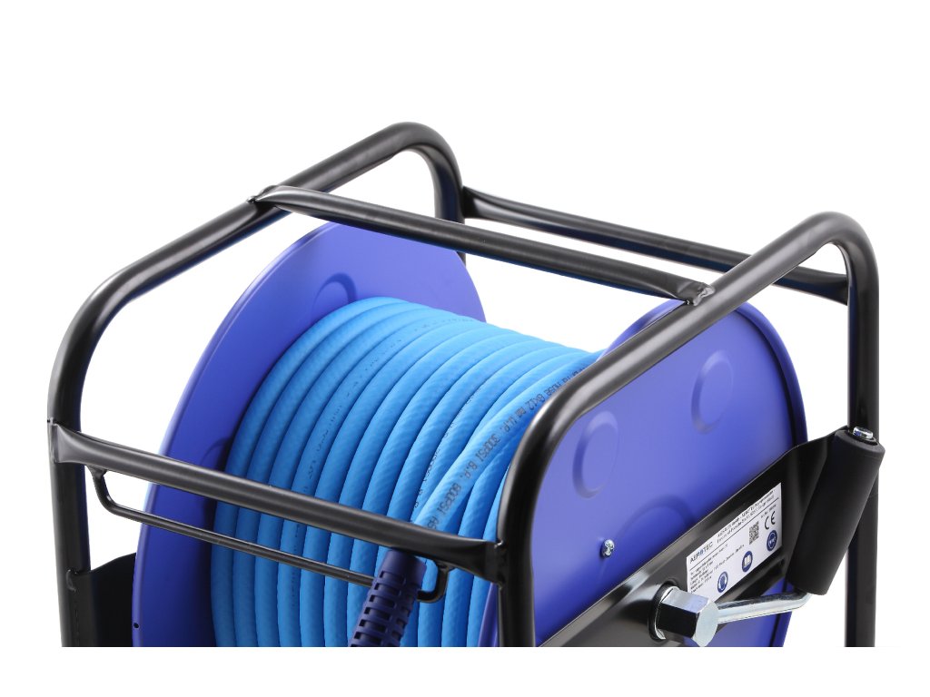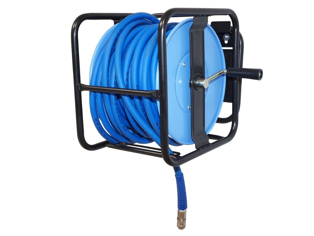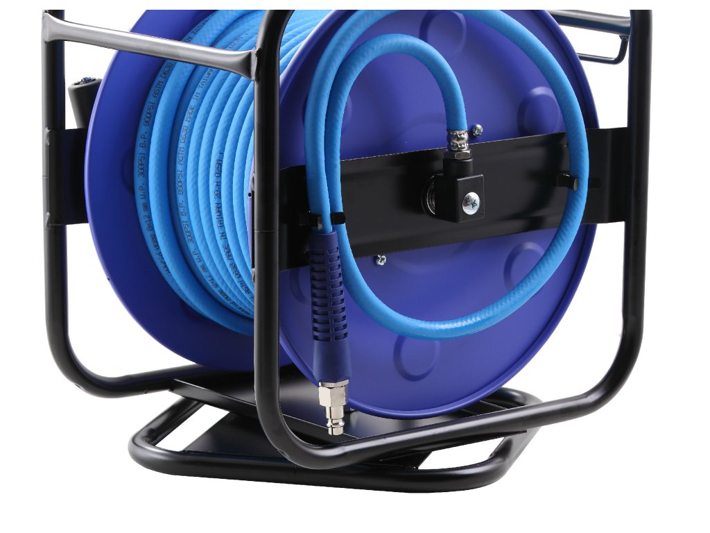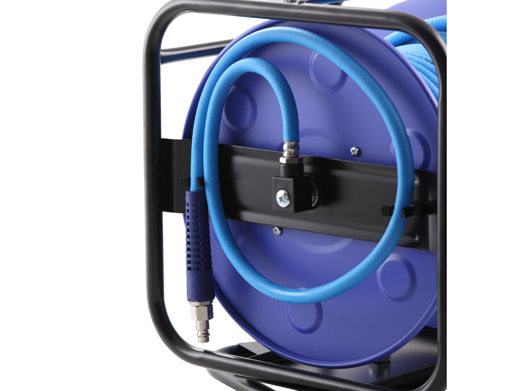 - Otočný ocelový rám: Rám je otočný o 360°, což umožňuje maximální flexibilitu při práci. Stabilní základna zaručuje, že naviják zůstane pevně na místě, ať už pracujete kdekoli.