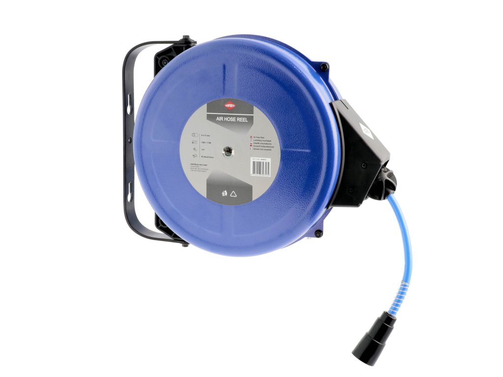 Navíjecí buben Airpress s polyuretanovou hadicí a s připojovací hadicí o délce 1,5m. Buben je v kovovém pozdře, dobře odolný nárazům. Snadná monáž na stěnu, díky integrovanému držáku.