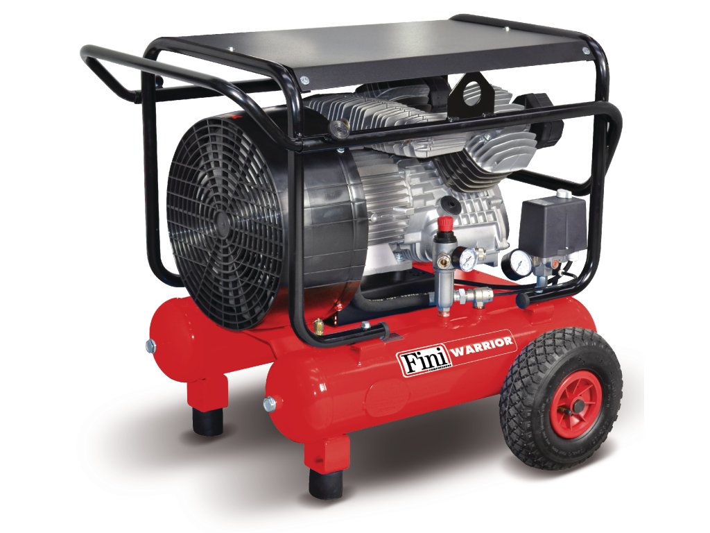 Pístový mobilní kompresor Fini Warrior 592 BuildAir s robustní konstrukcí na 400V s 20l tlakovou nádobou a velkým plnícím výkonem 420l/min. Vysoce kvalitní dvouválcová V-jednotka s nízkými otáčkami a přímým pohonem.