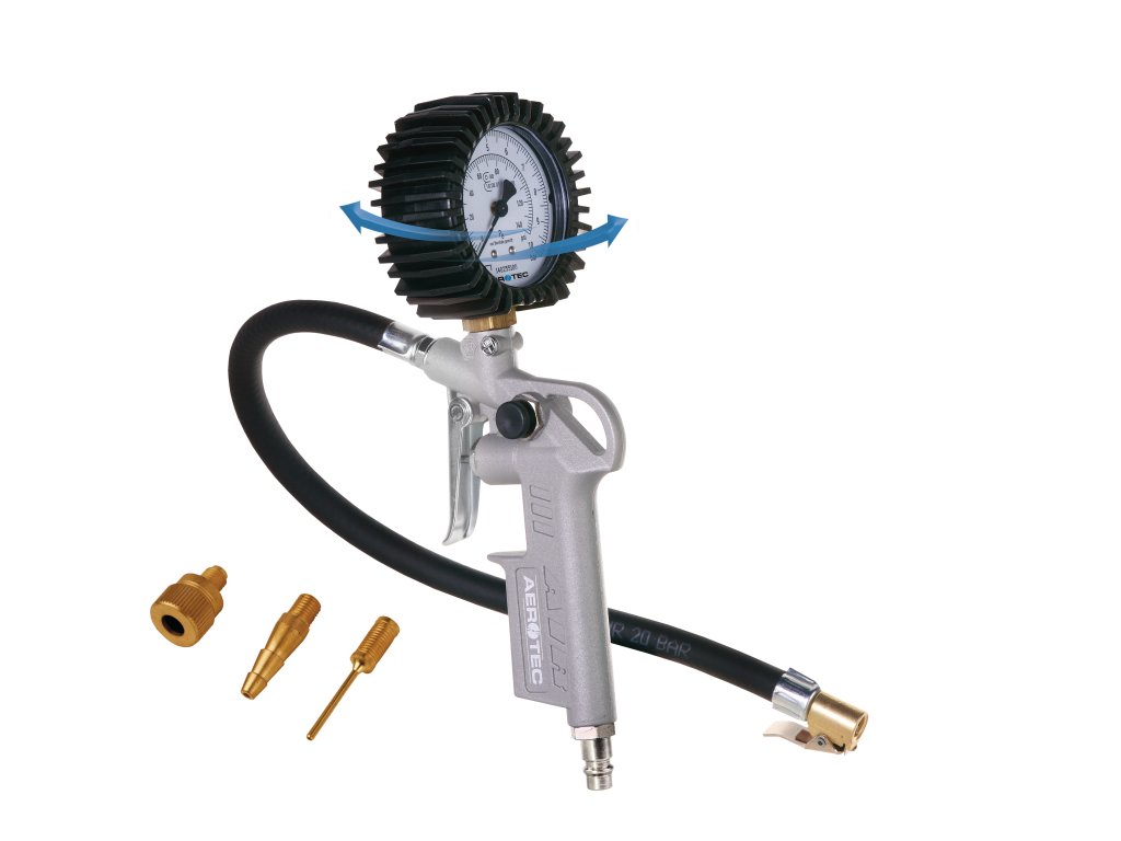 Pneuhustič kalibrovaný Aerotec ST + sada adaptérů se snadno čitelným kalibrovaným manometrem 63 mm a gumovou připojovací hadicí 30 cm. Součástí balení je sada tří adaptérů.